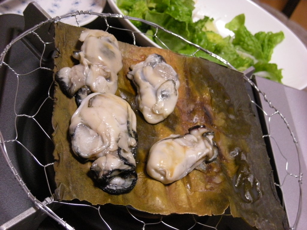 うちでは昆布の上に酒と塩で下味をつけた牡蠣をあぶって
