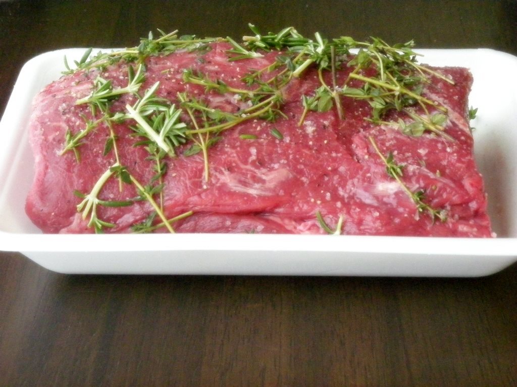 その後粗く切ったローズマリー/タイムを肉の表面に