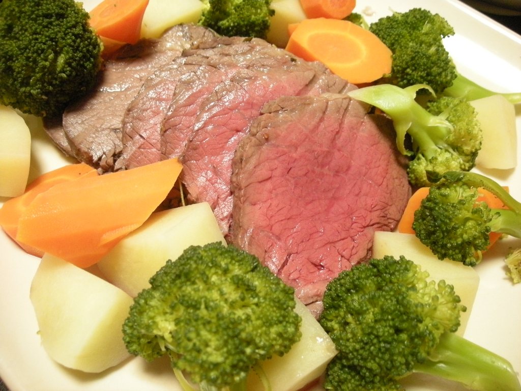①牛肉塊に、塩・胡椒をやや強めにする。