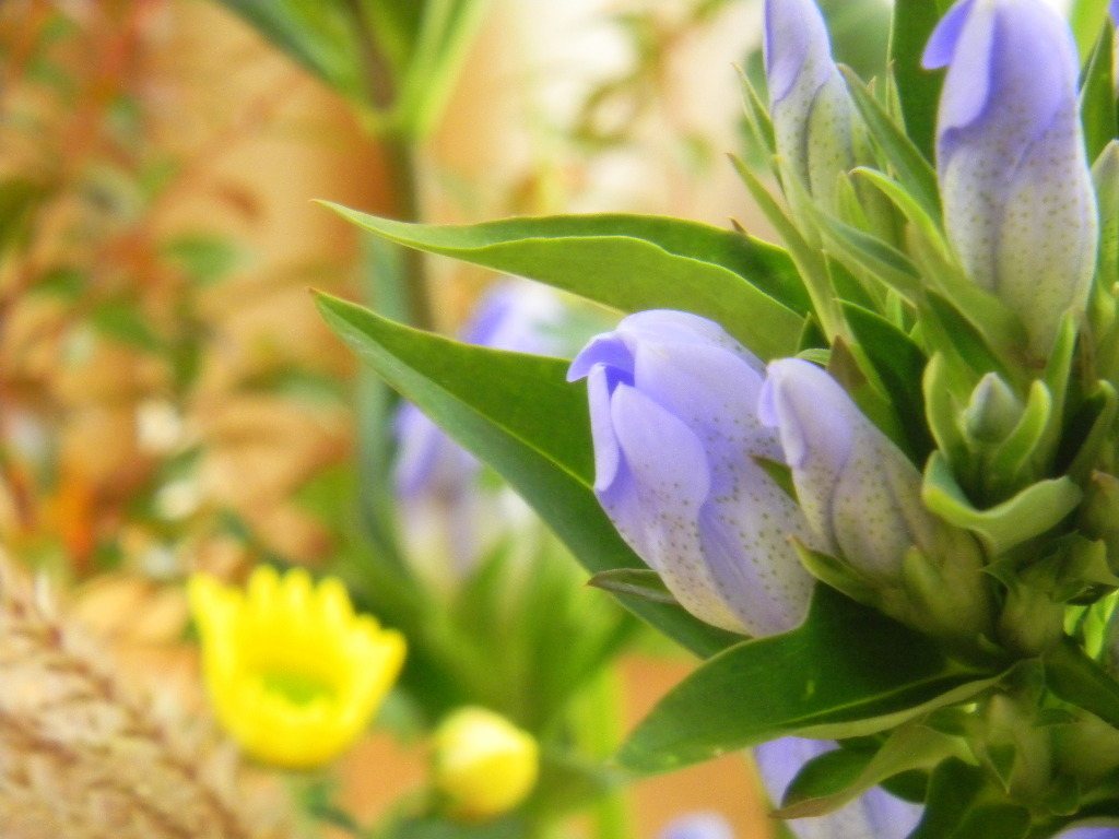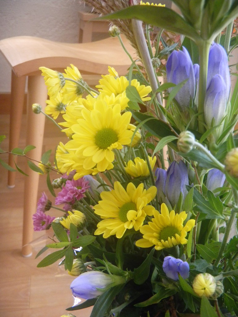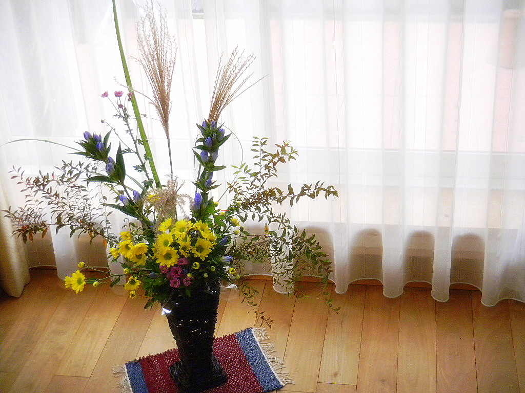 一番下に石を吊るしてあります。石の重さで花器替わりの浮きがくるくると回転している状態っす。